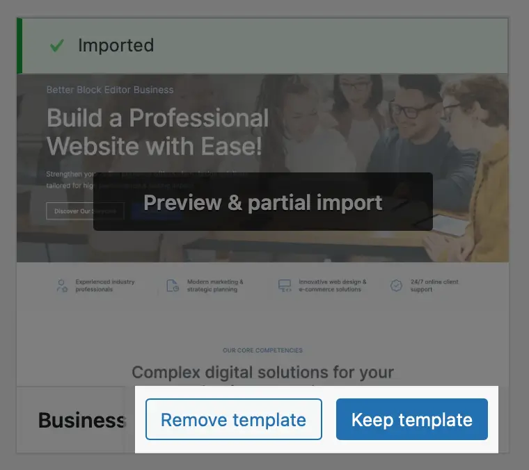 - Preview & partial import — opens the template preview in a separate window; use Partial Import to import only the parts you need.